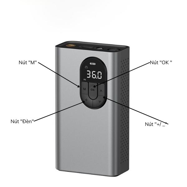 – Cấu tạo: Có kiểu dáng hình hộp chữ nhật, trên mặt trước của bơm có đồng hồ hiện thị áp suất lốp có thể chuyển đổi đơn vị và các nút bấm nguồn và nút bấm chức năng. Trên đầu của máy bơm lốp có một vòi bơm có đầu kẹp bơm để cắm vào van xe ô tô và một đèn Led. Bên trong máy bơm có pin, tụ, chip điều khiển thông minh.